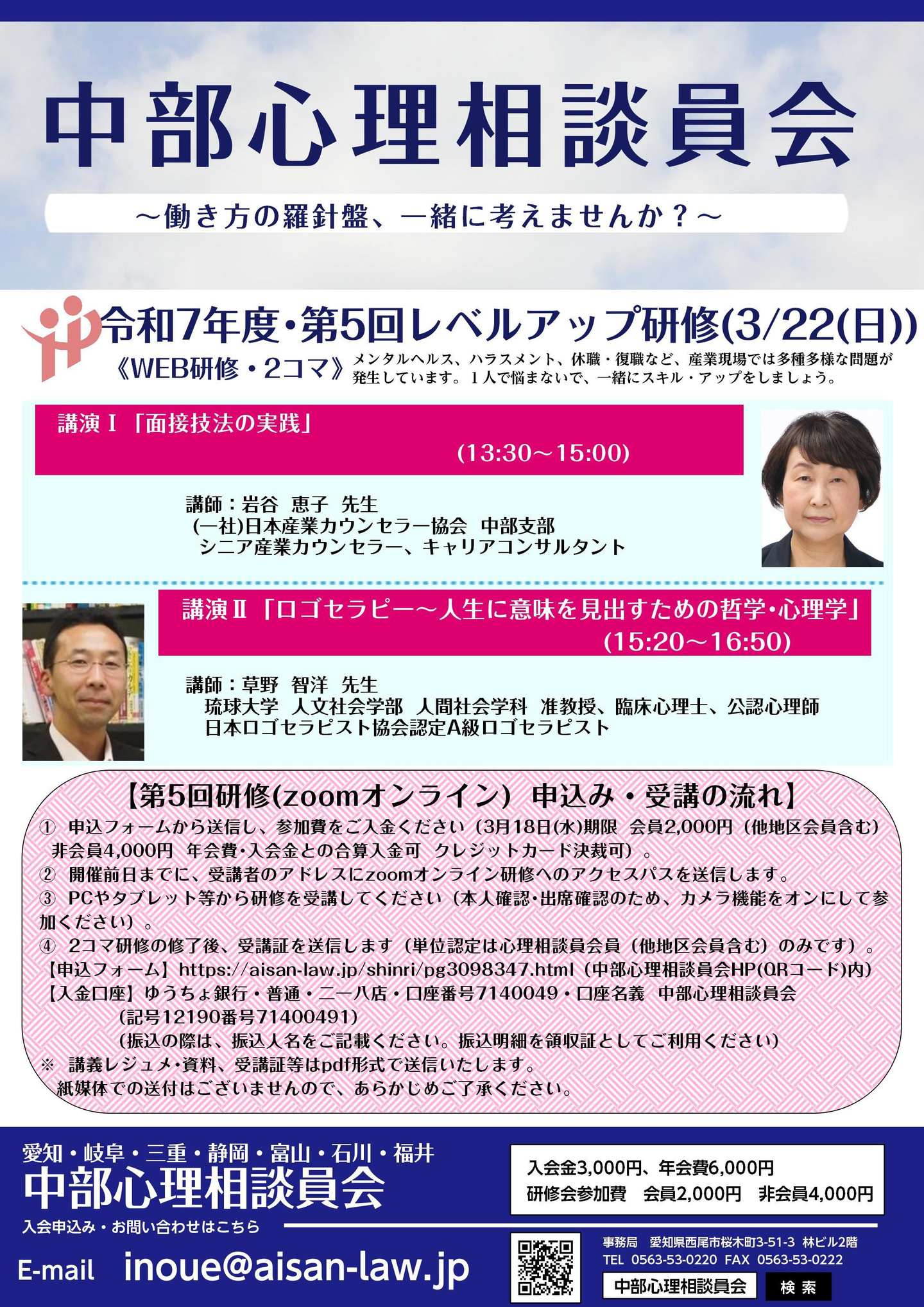 内容 【講演1】「面接技法の実践」 講師 岩谷 恵子 先生 (一社)日本産業カウンセラー協会 中部支部、シニア産業カウンセラー、キャリアコンサルタント 【講演2】「ロゴセラピー~人生に意味を見出すための哲学・心理学」 講師 草野 智洋 先生 琉球大学 人文社会学部 人間社会学科 准教授、臨床心理士、公認心理師、日本ロゴセラピスト協会認定A級ロゴセラピスト